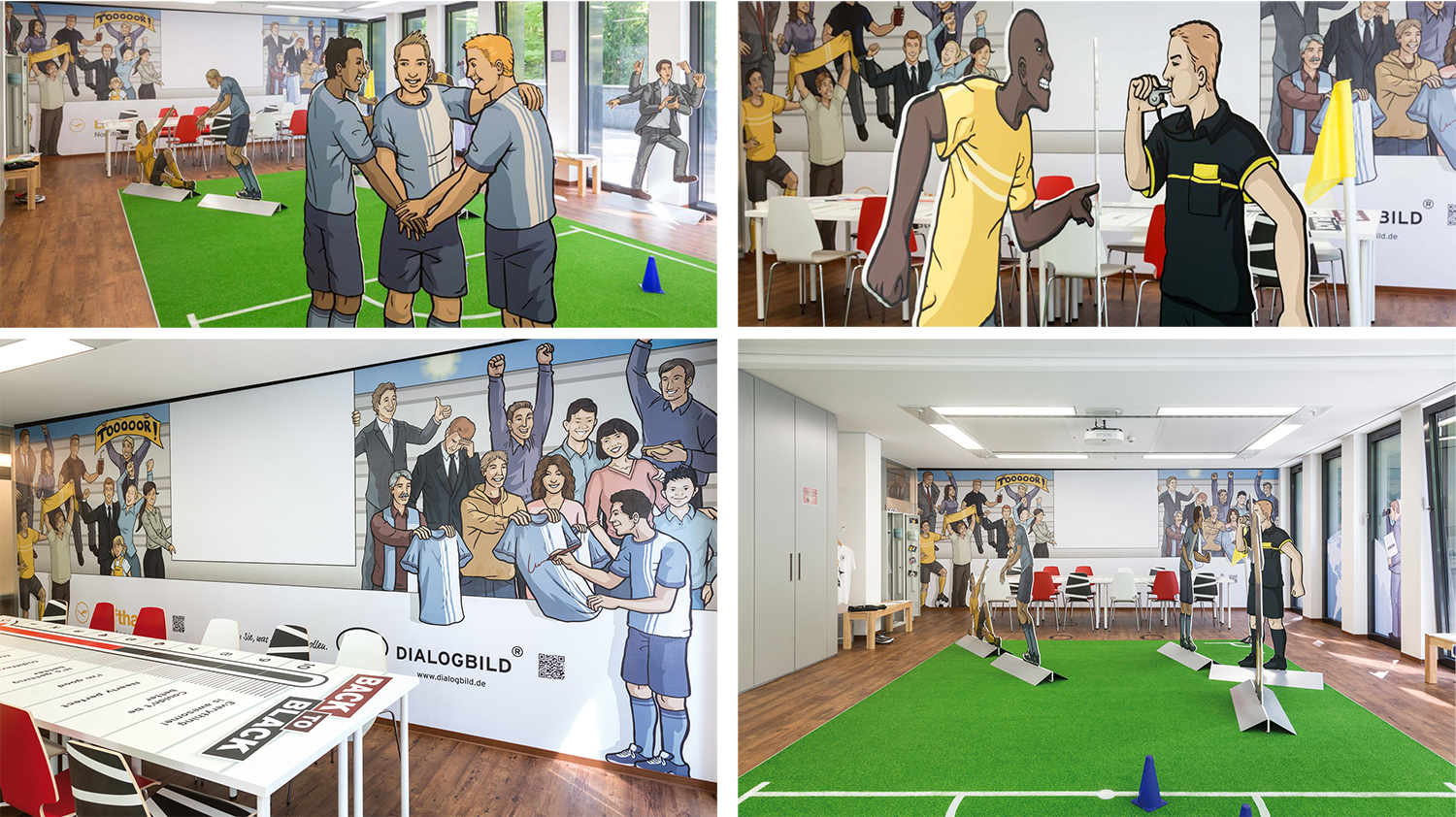 In the first "walk-in" dialog picture, a cooperation of the training and education management in Seeheim with the creative agency Dialogbild, the human being as player / employee, trainer / manager and as fan / customer is in the center. Framework conditions can be individually designed and strategic goals conveyed via the catchy theme of "football". Clear roles, defined tasks, flexibility, a common goal, good leadership, and attitude are the characteristics of a winning team.